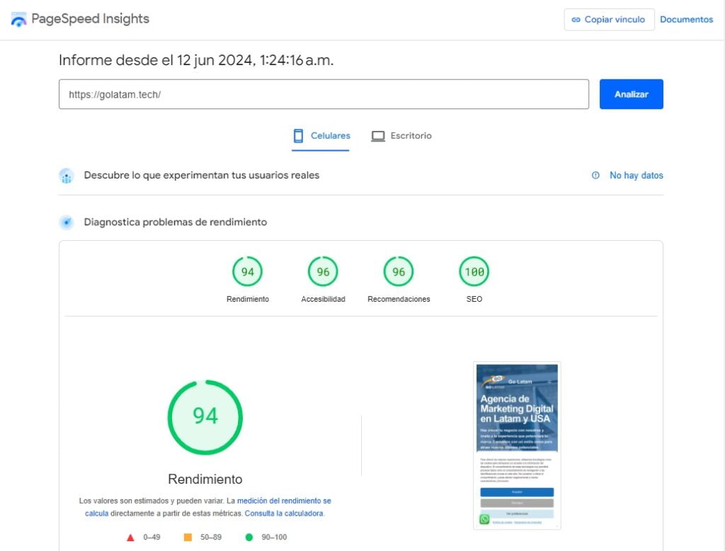 En Go Latam, conocemos la importancia de este factor de cara al usuario y al posicionamiento web. Por ello, hemos optimizado tanto en dispositivos moviles como en ordenadores, alcanzando una excelente valoración por parte de Google Pagespeed Insights. A continuación se muestra una captura de pantalla de la herramienta de Google: